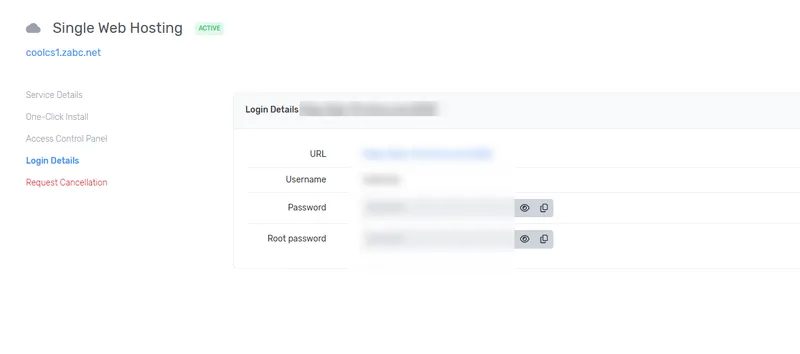 选 Access Control Panel 可以登入DA面板。选Login Details可以看见登录地址和账号密码