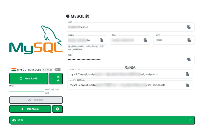 Filess免费提供多种类型的数据库托管,MySQL、MariaDB、PostgreSQL、MongoDB。免费版容量只有10M,可以创建2个数据库,每周自动备份,无限流量。