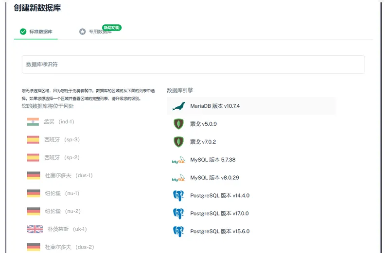 登录之后点击右侧的 new database 创建数据库。免费版无法选择地理位置,分配到哪个就用哪个。