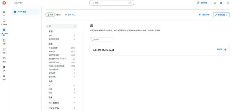 创建完成之后还可以点击Service configuration进行操作:添加域名、修改原则、配置waf防火墙等。已经生效的配置都无法修改,需要由方案1克隆一个配置方案2,再修改方案2,修改好后启动方案2。
