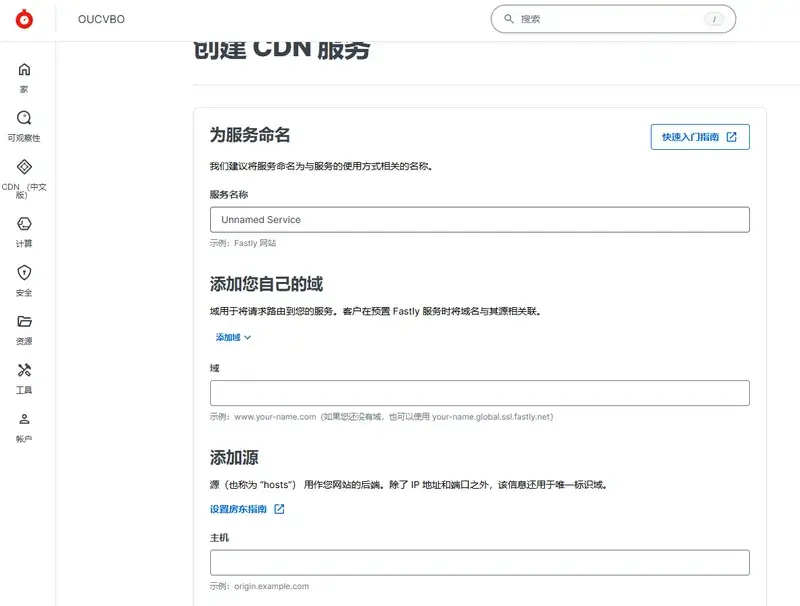 激活账号之后登录,点击 Create service – cdn 来创建,服务名称随便写。如果没有自己的域名,可以填写fastly自带域名如: xxxxx.global.ssl.fastly.net ,但是我们这里无法访问,所以最好还是填写自己的域名。下面填写源站地址,再往下的选项都不用修改,填写这三项直接提交。