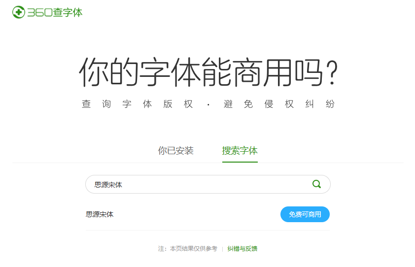 我们我们也可以搜索字体,将字体的名字输入查询,看这款字体是免费可商用还是需要授权。但是我发现360查字体这款工具字库并不是齐全的。很多字体不能查到,所以我们有些字体还需要手工查询。我们可以到这款字体的官方网站查询这款字体的授权级别。