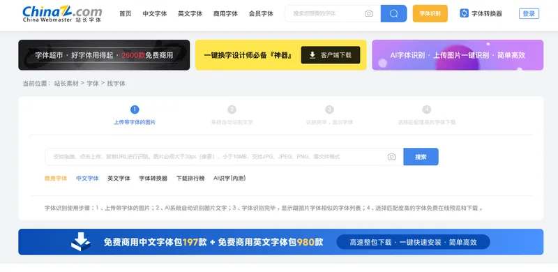站长字体(https://font.chinaz.com/zhaozi/),这款是由于站长之家提供的在线字体查询比较工具。我们通过上传含有字体的图片可以进行传统的字体比较,但是识别效果比较差。不过他们同时提供的AI识字的工具准备度比较高,而且可视化体验效果好。