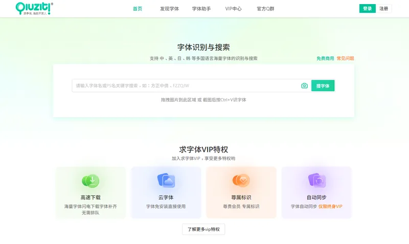 求字体(https://www.qiuziti.com/),这个网站还是比较专业且运营用有较长时间的。我们可以根据字体的中文名第一个拼音字母查询需要的字体,也可以根据图片上传后识别图片中使用的哪款字体。